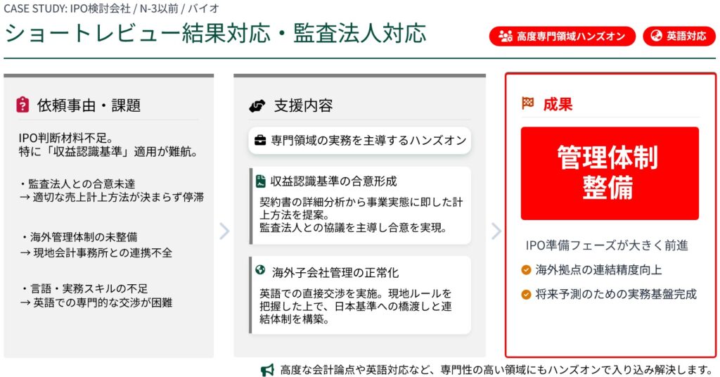 監査法人や海外拠点との窓口業務を引き継ぎ、実務を主導するハンズオン支援を実施しました。