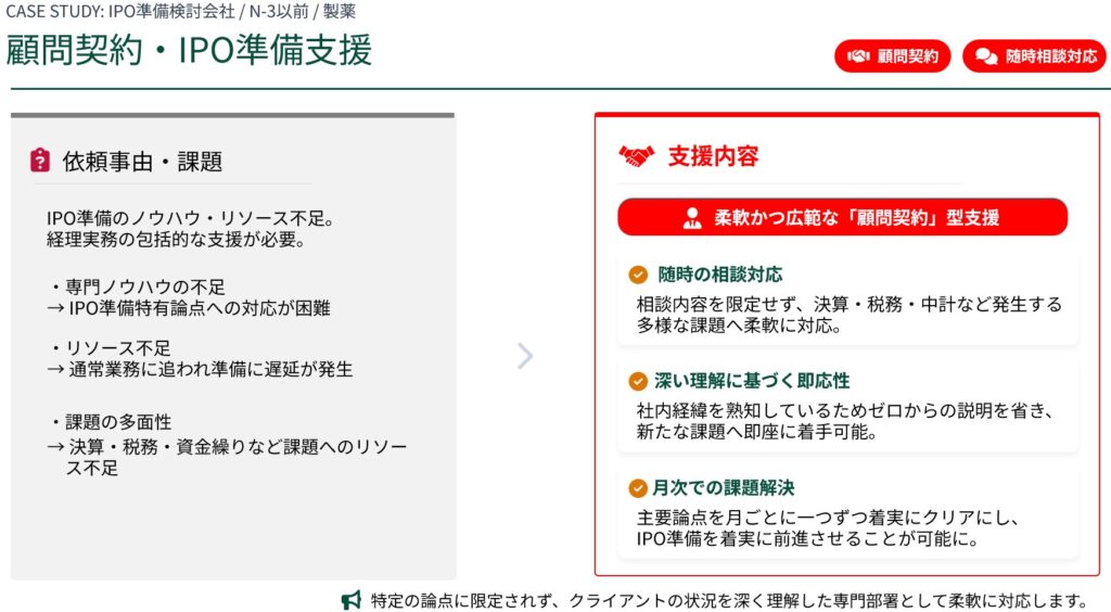 顧問契約に基づき、IPO準備にかかる特定の論点への相談に随時対応しています。本契約はスポットコンサルティングのように相談内容を限定せず、柔軟かつ広範に対応できる点が特徴です。